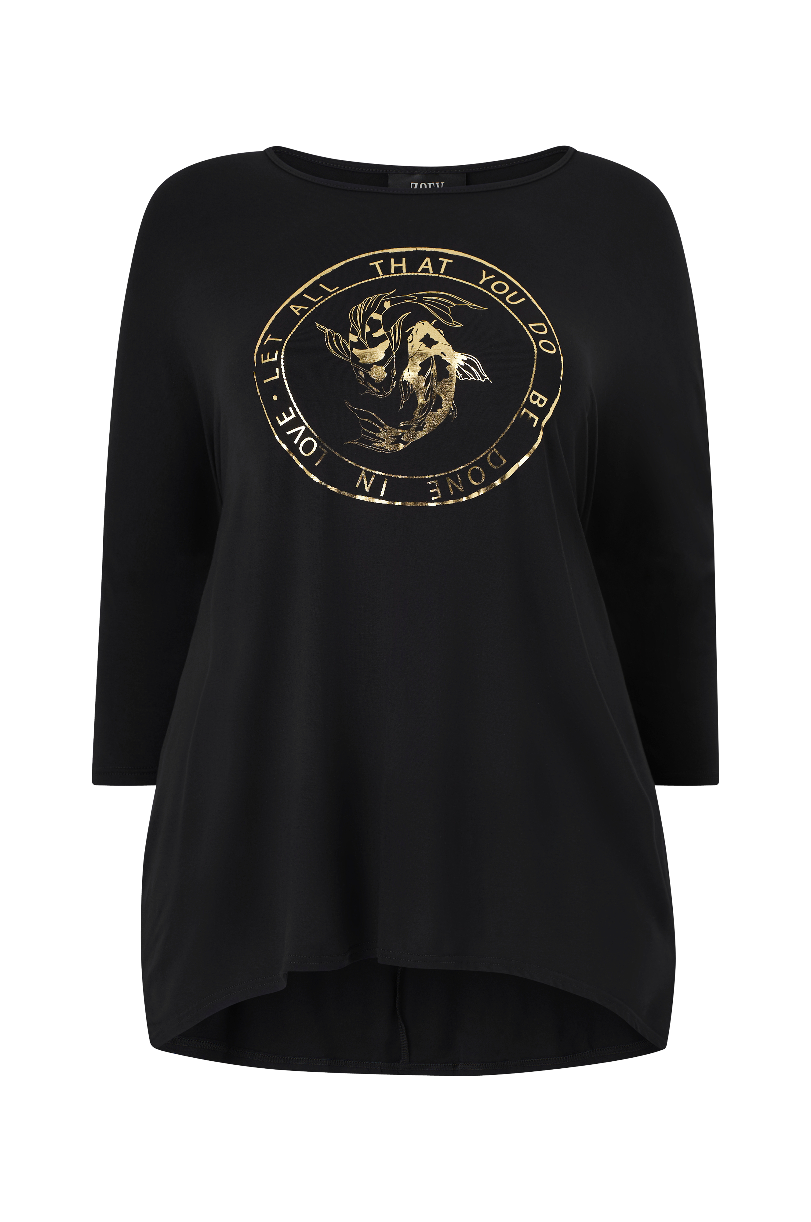 • Rund hals• Glansigt, guldfärgat tryck fram• Nerhasade axlar• 3/4-lång ärm• Längre bakstycke• Plusstorlekar