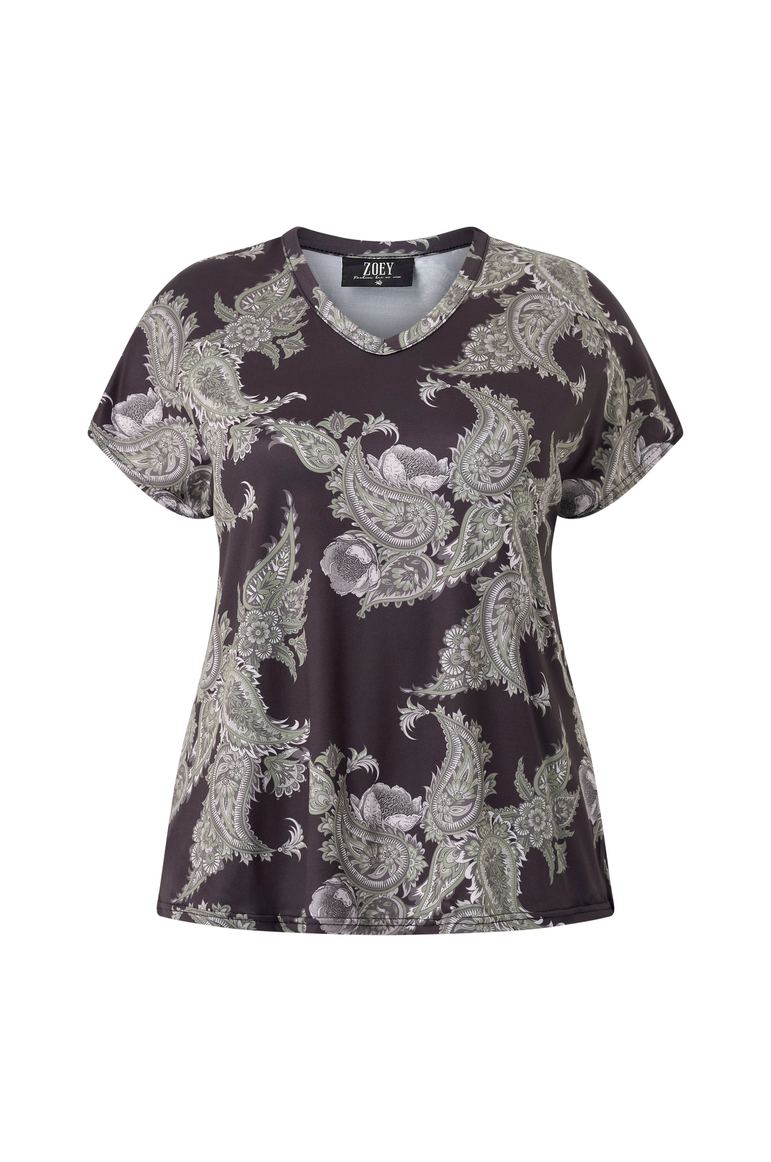 • Stretchig, paisleymönstrad topp• V-ringad hals• Korta holkärmar• Lätt rundad nederkant• Plusstorlekar