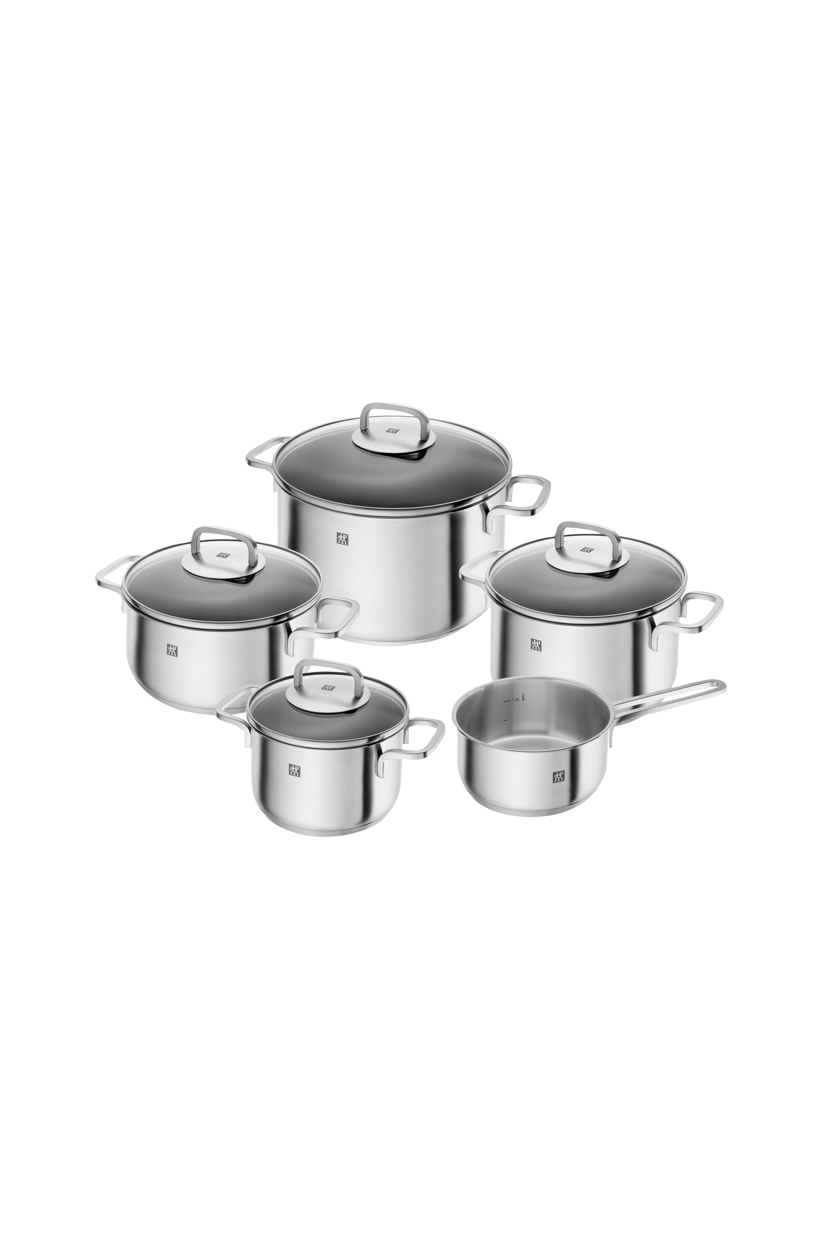 Cube grytset från Zwilling består av fem olika grytor (6, 4, 3, 2 och 1,5 liter) och fyra glaslock.